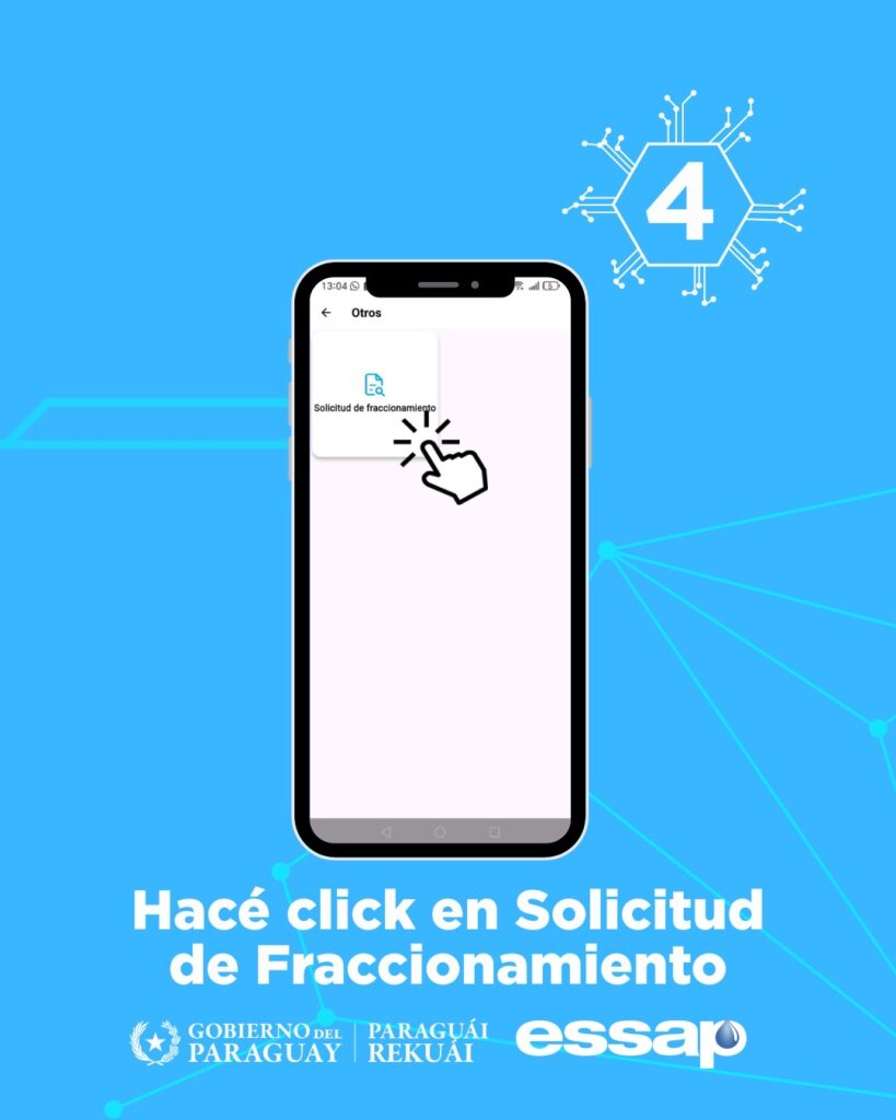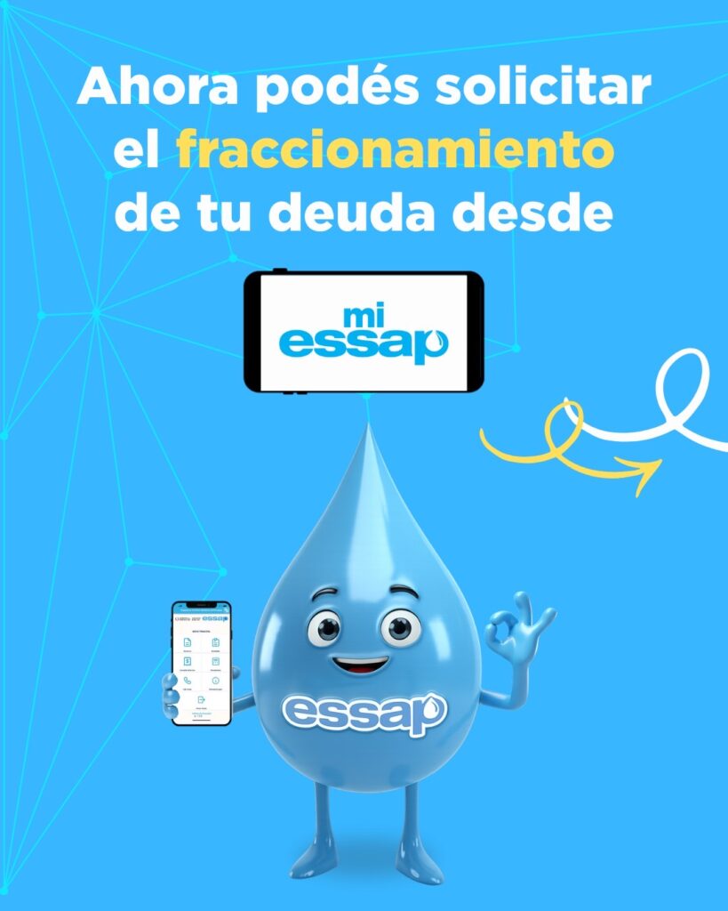La Empresa de Servicios Sanitarios del Paraguay S.A. (ESSAP) incorpora una nueva herramienta digital para facilitar la regularización de deudas sin necesidad de asistir presencialmente a los Centros de Atención al Público. Desde ahora, los usuarios podrán gestionar el fraccionamiento de sus cuentas de manera totalmente online, a través de la plataforma Mi ESSAP, disponible las 24 horas y desde cualquier dispositivo móvil.