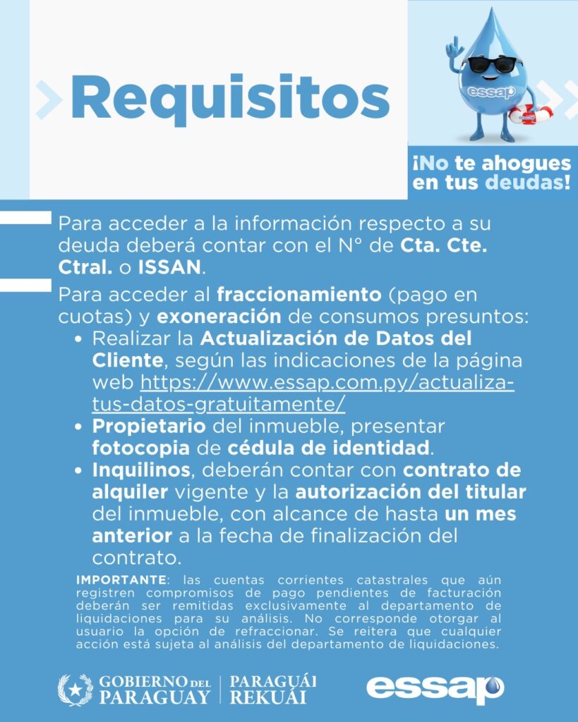 Para realizar los trámites será necesario contar con el número de Cuenta Corriente Catastral o ISSAN. En los casos de fraccionamiento o solicitud de exoneración de consumos presuntos, se requerirá la actualización de datos del usuario, además de la documentación correspondiente: el propietario deberá presentar fotocopia de cédula; los familiares, una autorización escrita del titular; y los inquilinos, contrato de alquiler vigente más la autorización correspondiente del titular del servicio.