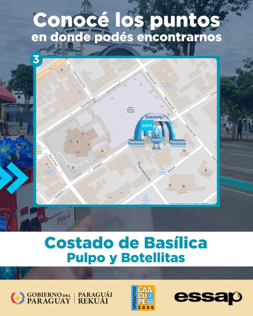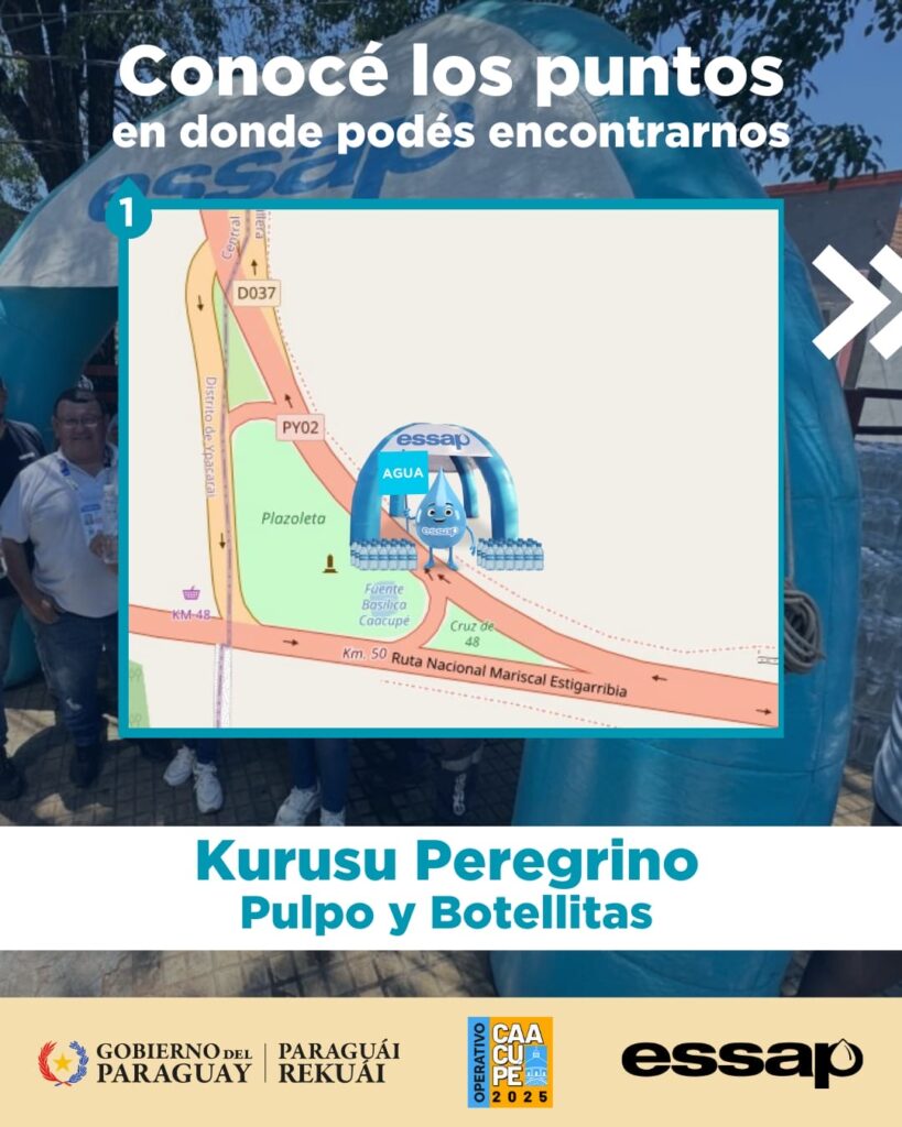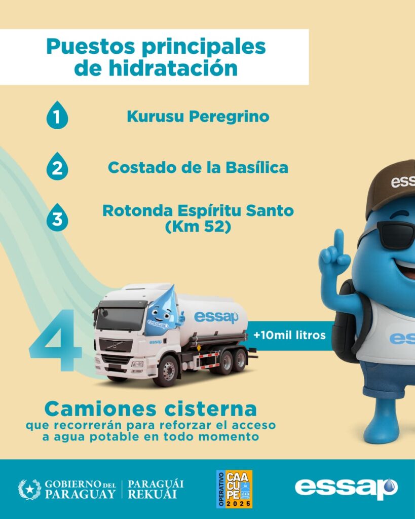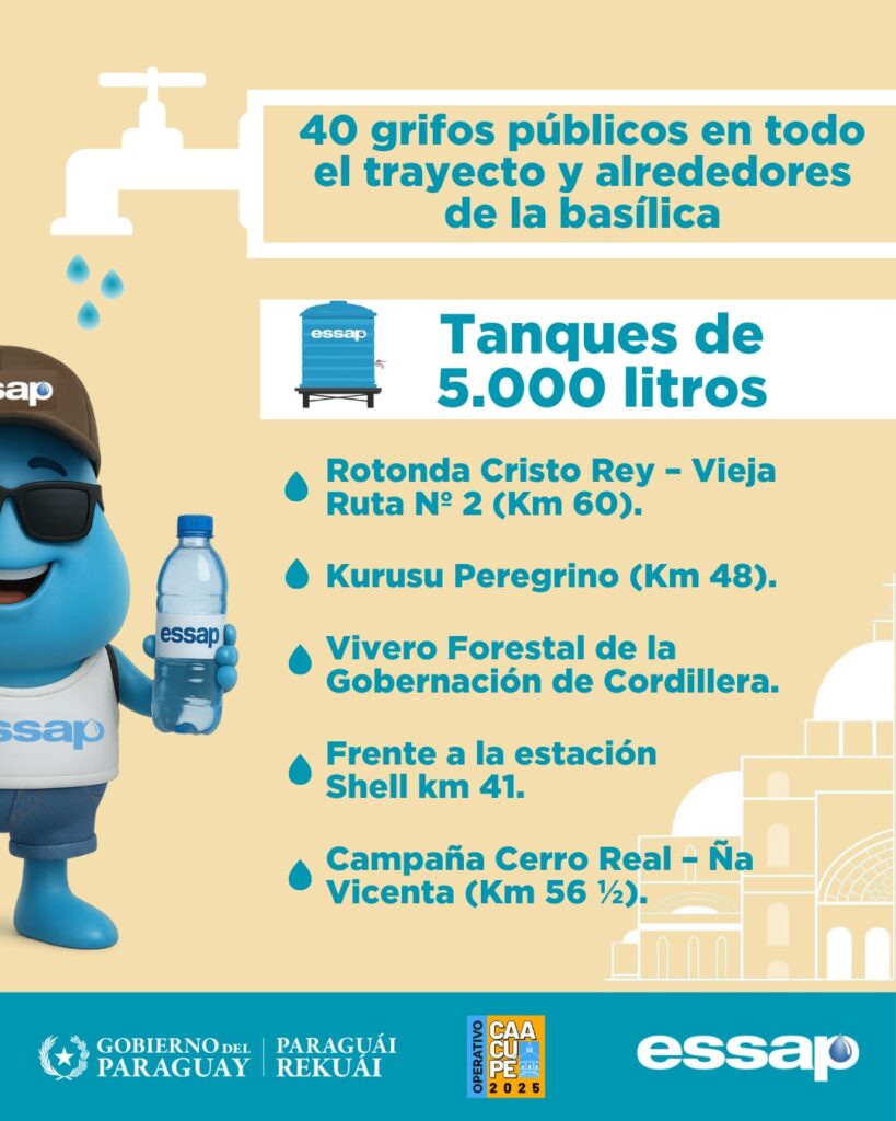 La Empresa de Servicios Sanitarios del Paraguay S.A. (ESSAP) puso en marcha el Operativo Caacupé 2025 para acompañar a los miles de peregrinantes que se dirigen hacia la Basílica de Nuestra Señora de Caacupé, garantizando puntos seguros de acceso al agua potable durante toda la festividad.
