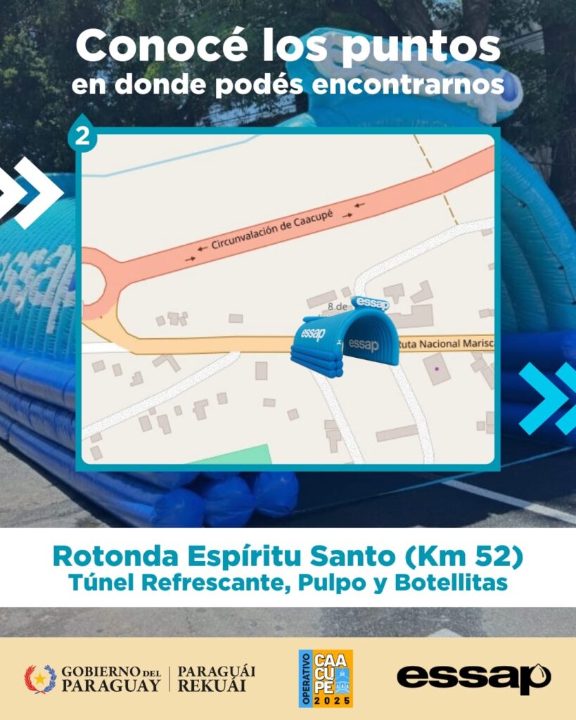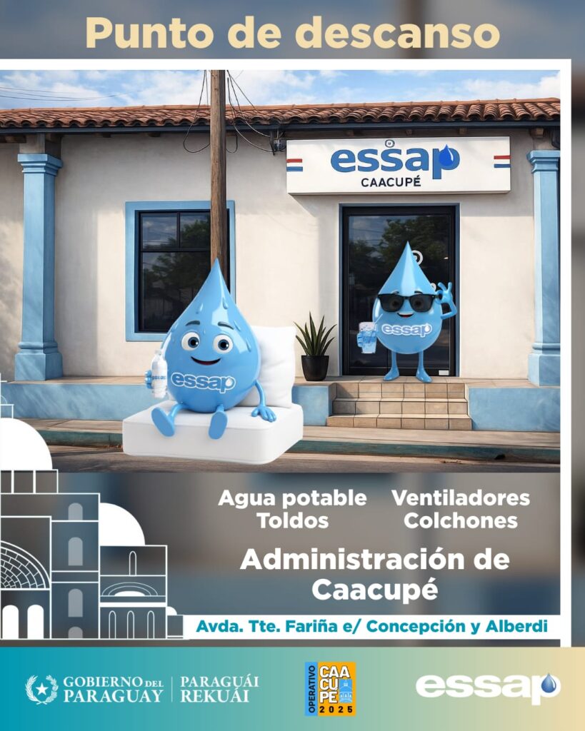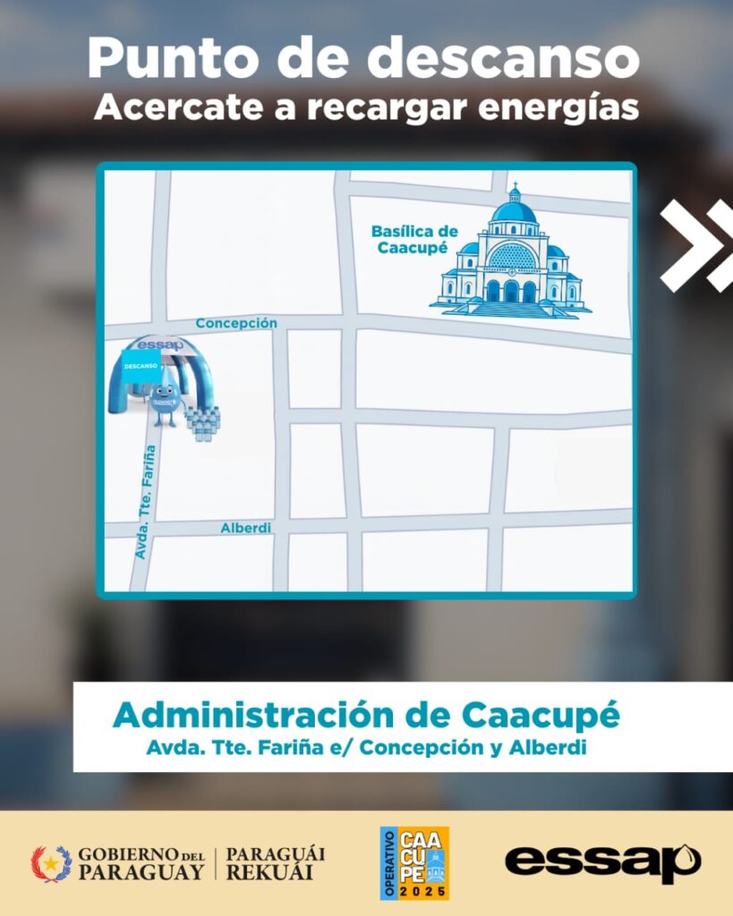Como apoyo adicional, la ESSAP habilitará un espacio de descanso frente a su oficina administrativa de Caacupé (Avda. Tte. Fariña e/ Concepción y Alberdi), equipado con colchones, toldos, agua y ventiladores, para que los caminantes puedan recuperar energías en un ambiente seguro y confortable.